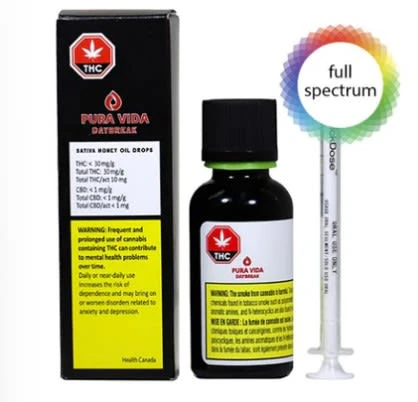 Pura Vida’s DAYBREAK Honey Oil drops are carefully extracted from hand-selected sativa-dominant flower (Kali Mist) and combined in pure organic MCT Oil. The proprietary extraction process allows a full plant profile, preserving the plant’s distinctive sweet earthy notes and subtle berry flavours without the need for back-added terpenes. This oil contains approximately 25.5-34mg/g of THC.